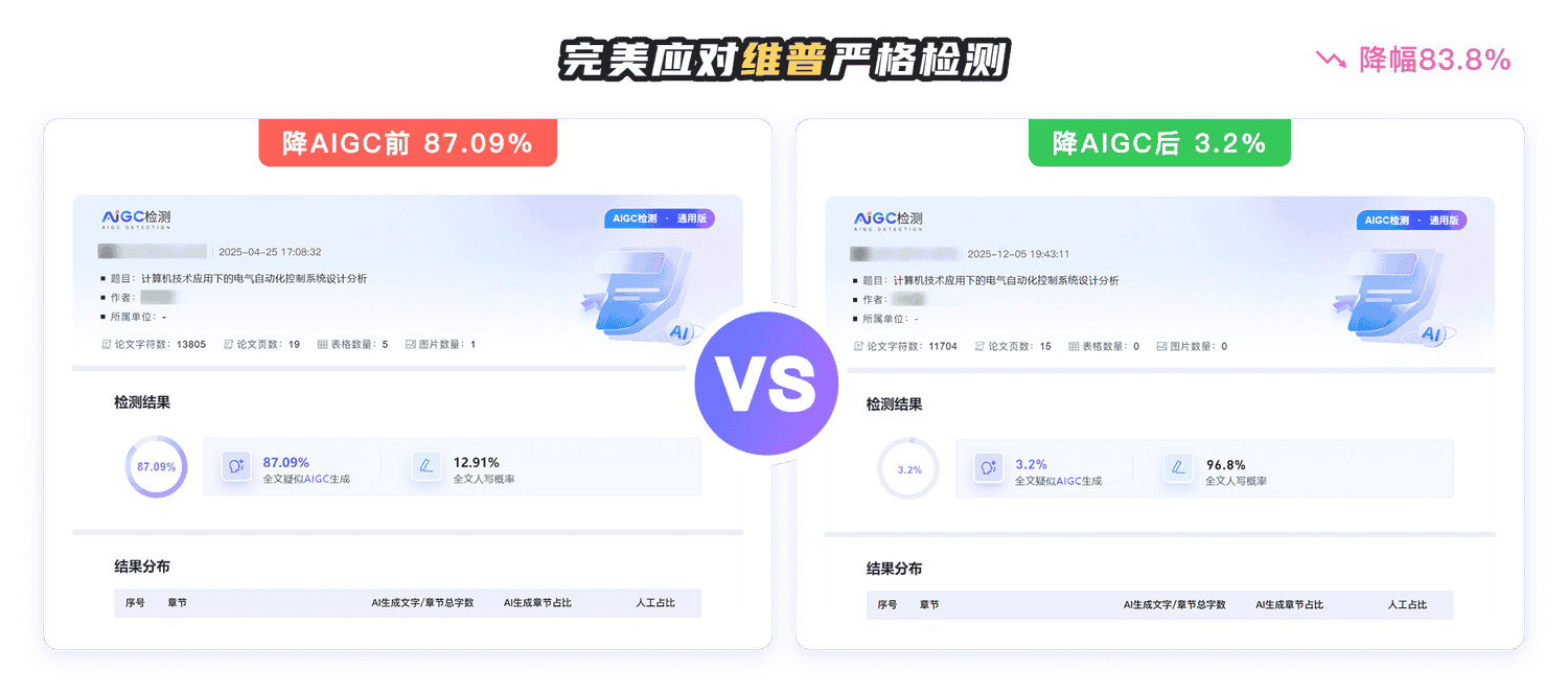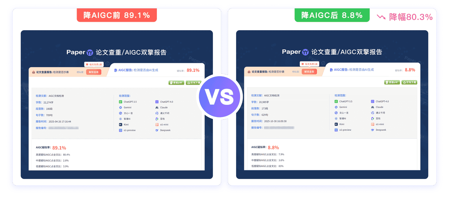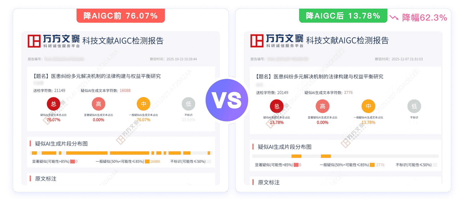 承诺处理后的结果,其知网/维普查重率低于15%,AIGC率低于20%,以可量化的标准确保降重、降AIGC质量。